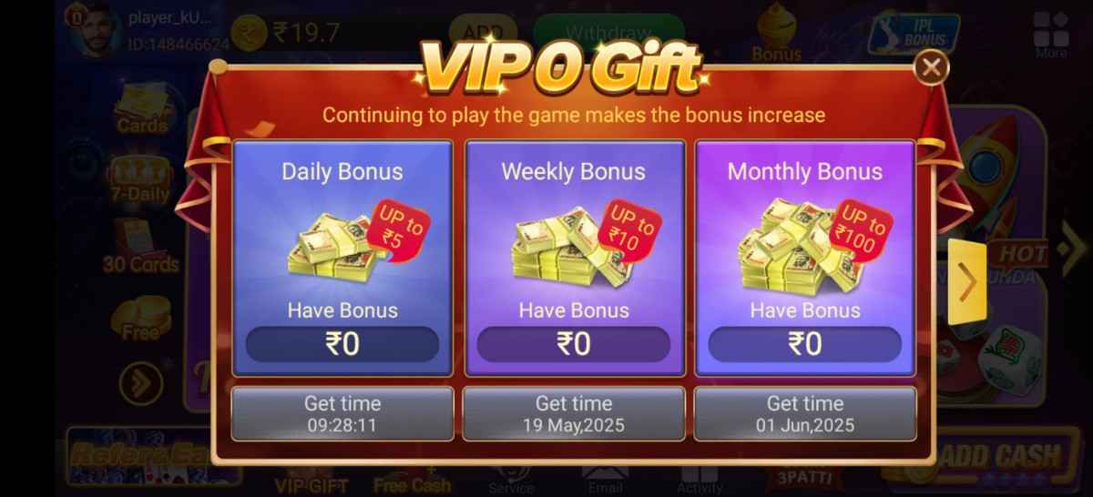 If you have downloaded this app, then share this application with your friends too. When you add money to this VIP program, you will get Weekly, Monthly, Daily or Level Bonus. Daily Bonus is given to the players of the app.